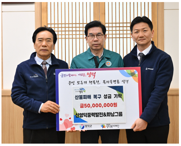 향토 기업인인 지역 출신 사업가 신영덕풍력발전·화남그룹의 박몽용 회장과 화남건설 박현재 대표가 1일 오전 8시 30분께 영덕 군수실에서 산불피해 성금 5,000만 원을 기부했다.